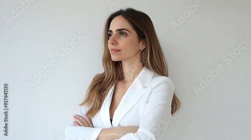 A confident Hispanic woman in a white blazer stands with arms crossed, gazing thoughtfully into the distance against a light background.