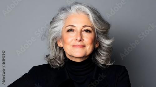 A confident, mature woman with shoulder-length, wavy silver hair smiles gently at the camera, wearing a black turtleneck and jacket against a gray backdrop