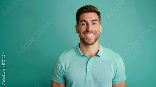 A confident millennial man in a polo shirt, smiling brightly at the camera against a solid teal background