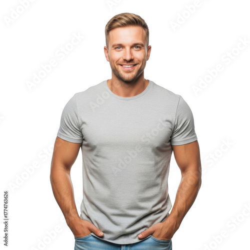 A confident smiling young man with short blonde hair wearing a light gray t shirt and blue jeans isolated on transparent background