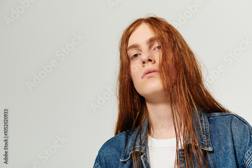 A confident teenager with flowing red hair displays his trendy denim ensemble against a simple backdrop.