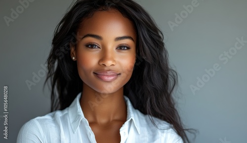 A confident woman in a bright and soft color formal attire with a bright smile, set against a simple white background.