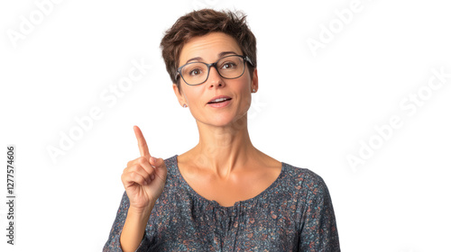 A confident woman with glasses gestures thoughtfully, engaging the audience with her ideas and insights. Her expression shows determination and wisdom.