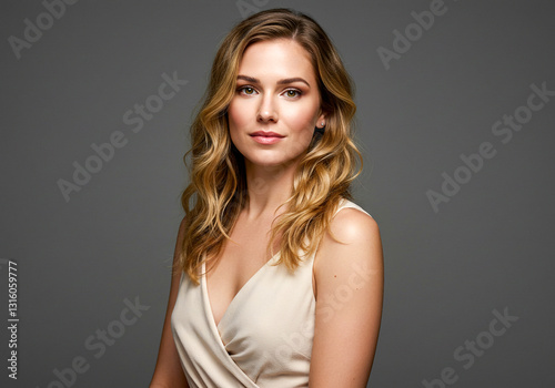 A confident woman with wavy blonde hair, wearing an elegant beige dress. She has a poised expression and a graceful posture, set against a dark grey background, exuding sophistication and charm.