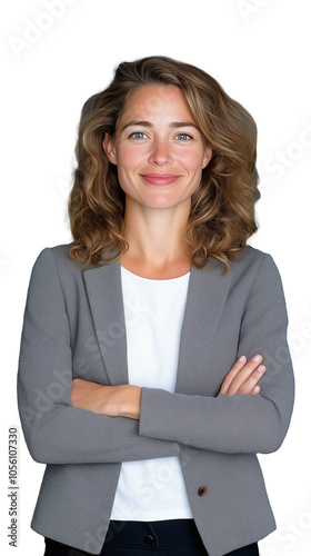A confident woman with wavy hair wearing a grey blazer, arms crossed, isolated on a transparent background. Perfect for business and professional themes.