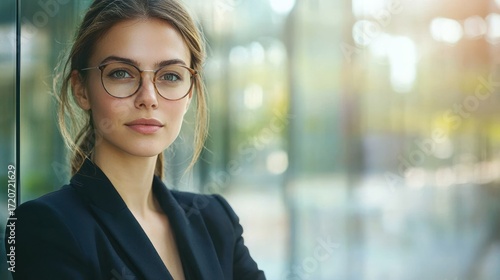 A confident young businesswoman in a black suit standing in front of a glass wall.