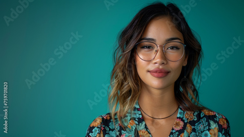 A confident young woman with glasses, featuring a floral top against a teal background, poses for a casual portrait.