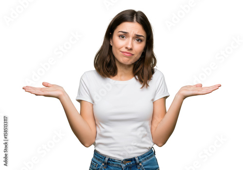 A confused young woman in a white tshirt and jeans shrugs with open palms, isolated on transparent background