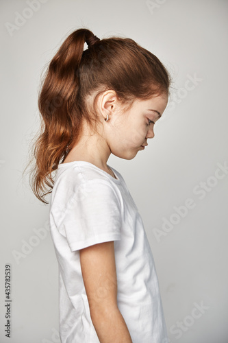 A cute 10-year-old model with an oriental appearance expresses sadness, dressed in a white T-shirt. Portrait of a studio shot on a white copy space. Expression of emotions