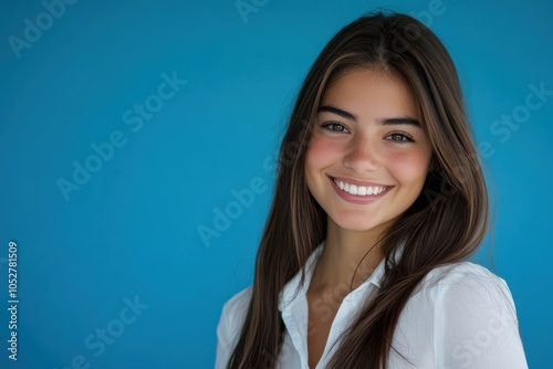 A Cute Caucasian woman with a radiant smile and white shirt stands confidently against a turquoise background, her charm and beauty shining through.