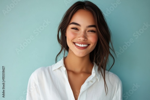 A Cute Caucasian woman with a radiant smile and white shirt stands confidently against a turquoise background, her charm and beauty shining through.