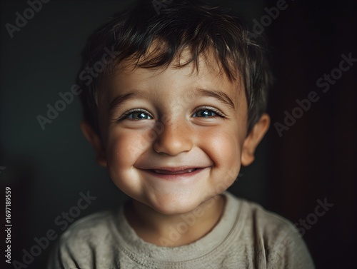 A delightful young boy with brown hair and big blue eyes is joyfully smiling for the camera closeup shot.