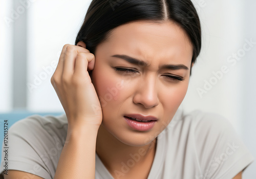 A distressed young woman with a tear on her cheek holds her ear, suffering from a painful earache or infection.