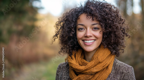 A dynamic headshot of a woman with curly hair, smiling brightly, with a natural outdoor background
