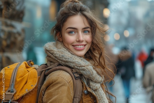 A fashionable woman wearing a warm coat and scarf smiles at the camera while standing on a busy street, exuding confidence and style in the winter cityscape