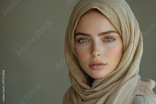 A fashion-forward photo of a model wearing a modest, elegant outfit in neutral tones. Generative AI