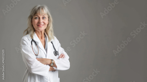 A female doctor in a white coat with a stethoscope around her neck smiles confidently at the camera with her arms crossed.