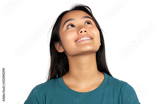 a filipino woman looking up in awe and happy, wearing a blue teal t-shirt, white background