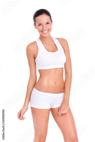 A fit young woman in gym wear smiling and posing isolated on a PNG background.