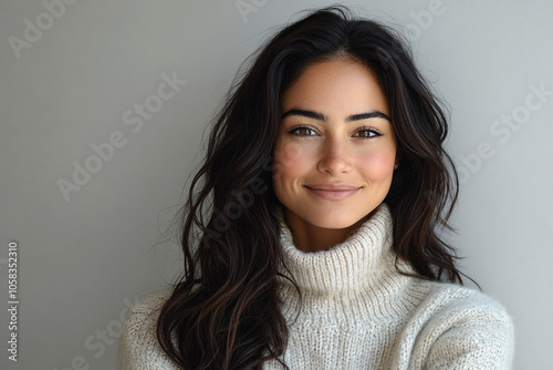 A friendly Indian woman in a cozy beige turtleneck presents warmth and approachability, ideal for lifestyle blogs, marketing campaigns, or wellness promotions.