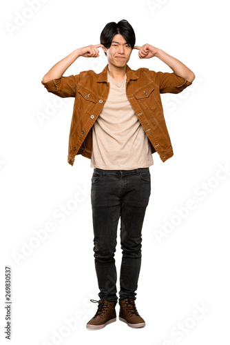 A full-length shot of a Asian man with brown jacket frustrated and covering ears over isolated white background