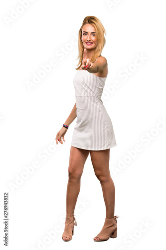 A full-length shot of a Young blonde woman showing and lifting a finger over isolated white background