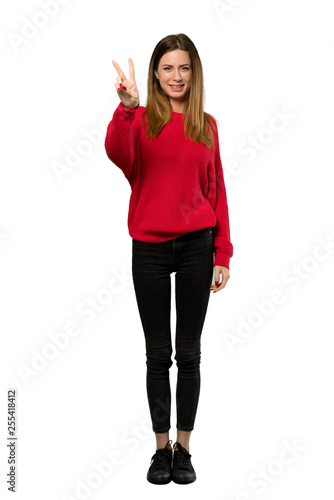 A full-length shot of a Young woman with red sweater smiling and showing victory sign over isolated white background