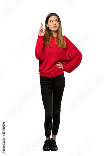 A full-length shot of a Young woman with red sweater with fingers crossing and wishing the best over isolated white background