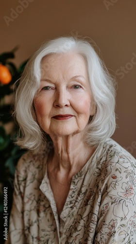 A gentle smile graces the face of an elderly woman, highlighting her wisdom and life experience. Soft light illuminates her features, creating a warm, inviting atmosphere enriched by greenery
