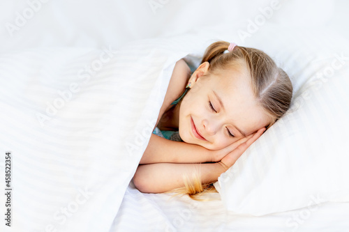 a girl child sleeps on a bed at home on a white cotton bed and smiles sweetly in her sleep with her hands folded under her cheeks