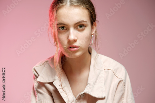 A girl in a pink denim shows different emotions and poses on a pink background.