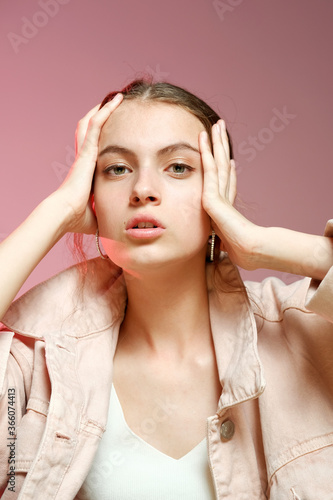 A girl in a pink denim shows different emotions and poses on a pink background.