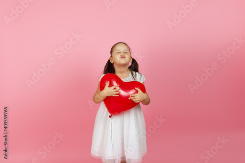a girl with closed eyes in a white dress holds a red balloon in the shape of a heart and blows a kiss, isolated on a pink background.