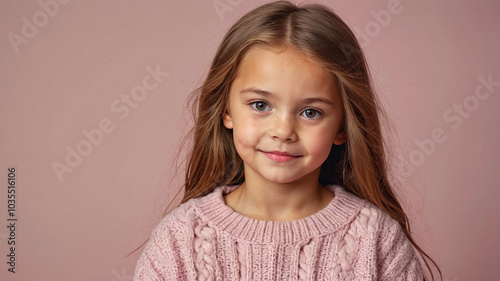 A girl with flowing dark hair in a pink sweater, showcasing serene beauty and innocent childhood charm.