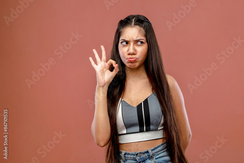 A Glam Model Is Making A Sad Pout Face And Showing An Okay Hand Sign