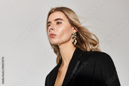 A graceful young woman in a sleek black outfit highlights her elegance and long blonde hair.