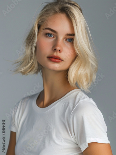 A half-body portrait of a Polish female high-fashion model with blonde hair, age 20-25, bob cut hair, blue eyes, classic beauty, in white T-shirt, in gray background