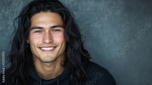 A handsome good-looking young man with long black hair smiling, studio shot close up model photography, gray textured wall background. wearing black hoodie.