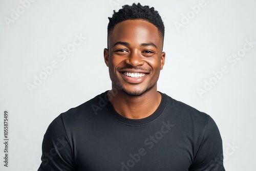 A handsome young man in a fitted black T-shirt smiles under vibrant studio lights, with a clean white background.