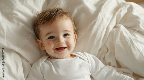A happy baby smiling on soft bed, radiating joy and innocence.