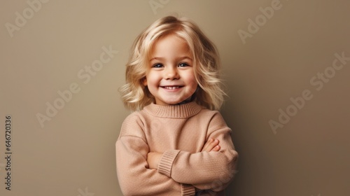A happy, blonde child in neutral attire, smiling against a beige studio backdrop. Generative AI