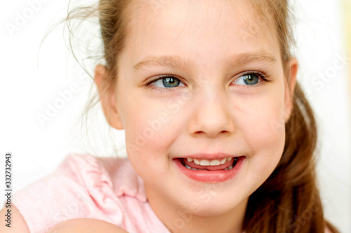 a happy girl in a pink school- age t-shirt without a front tooth laughs. To close. Diphyodont. Isolated on a white background. health