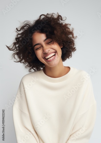 A happy hispanic woman wear cream sweater laughing fashion adult.