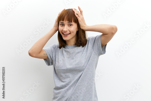 a happy, joyful woman in a gray cotton T-shirt stands against a light background, smiling happily and looking away, holding her hair with her hand.