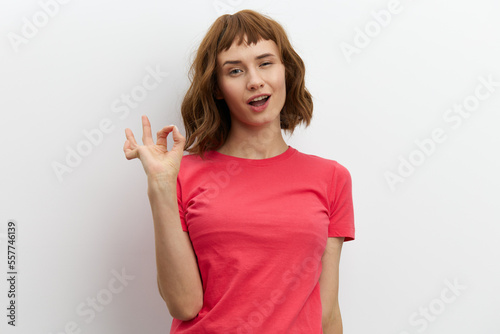 a happy, joyful woman poses standing on a white background in a pink T-shirt and smiling pleasantly shows the ok sign