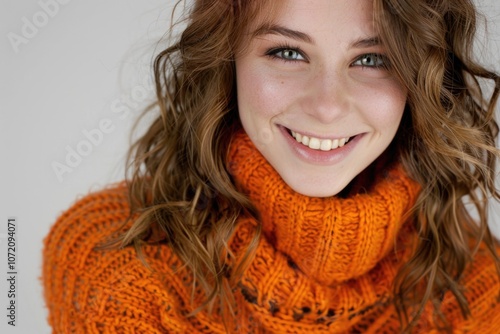 A happy woman wearing an orange sweater and smiling at the camera