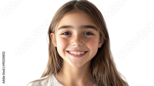A happy young girl with long brown hair looks directly into the camera, perfect for portraits and personal projects