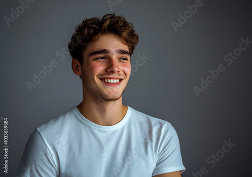 A happy young man wearing a white t-shirt, against a solid grey background.