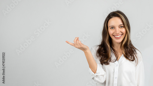 A happy young woman with a charming smile gestures with her hand as if holding something