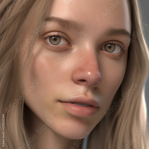 A highly detailed, hyper-realistic close-up portrait of an AI-generated human face. This digital artwork features lifelike skin textures, expressive eyes, and natural lighting.
